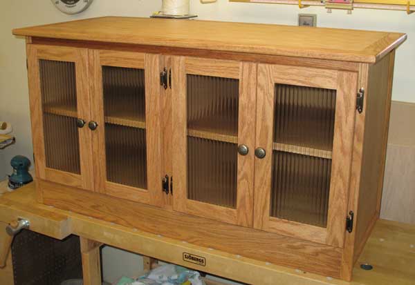 This is a TV stand I built for our HDTV. The stand measures approximately 48″ x 18″ x 26″. It is made of oak plywood and solid oak trim. The doors have reeded glass. The construction involves dado and rabbet and biscuit joinery and has mission style design elements.