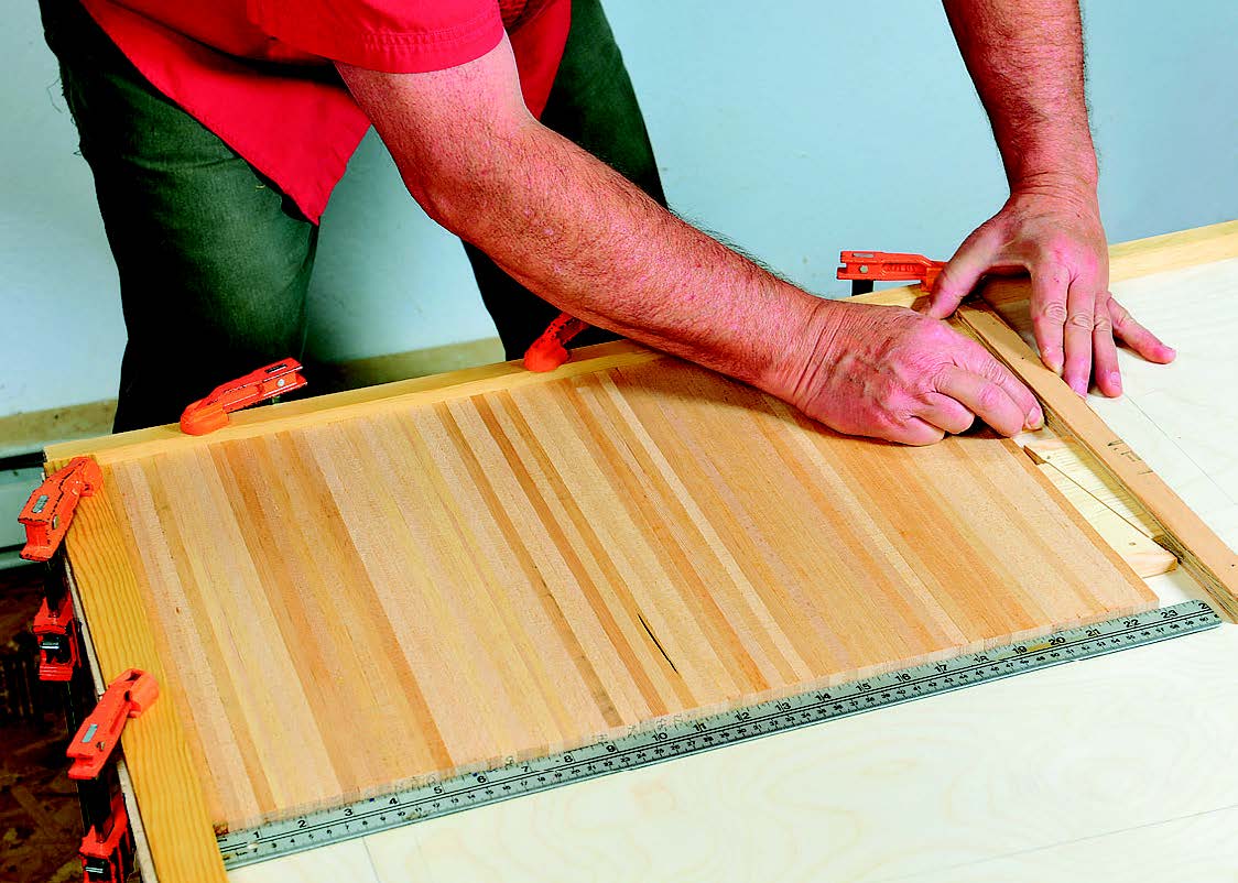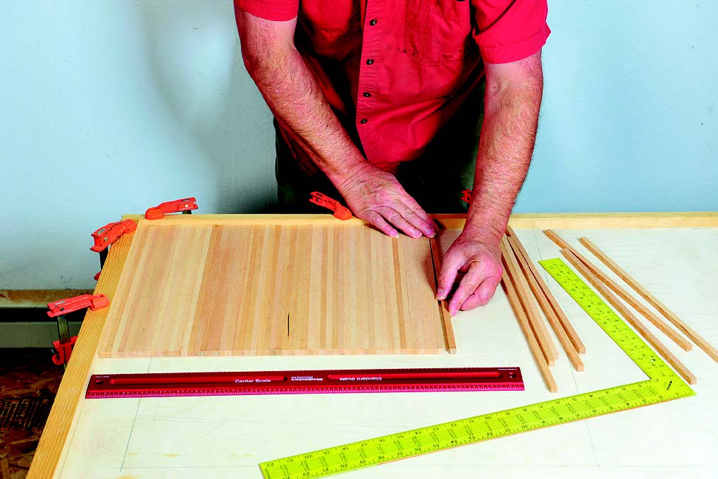 Next, make an alignment board from a flat piece of plywood or MDF that’s at least 2-1/2 feet square. Clamp a pair of straight strips flush with two adjacent edges, using a framing square or triangle to assure that the strips are exactly square to one another. Now lay the slats atop the board face-up and flush to the alignment strips so that they form a continuous sheet, like for a tambour door. Reject any slats that are warped or wonky. Number the end of the slats sequentially, moving from right to left. Underline the numbers 1, 6, 8, 9, 11 and 19, to avoid confusing the slat’s top and bottom surfaces.
