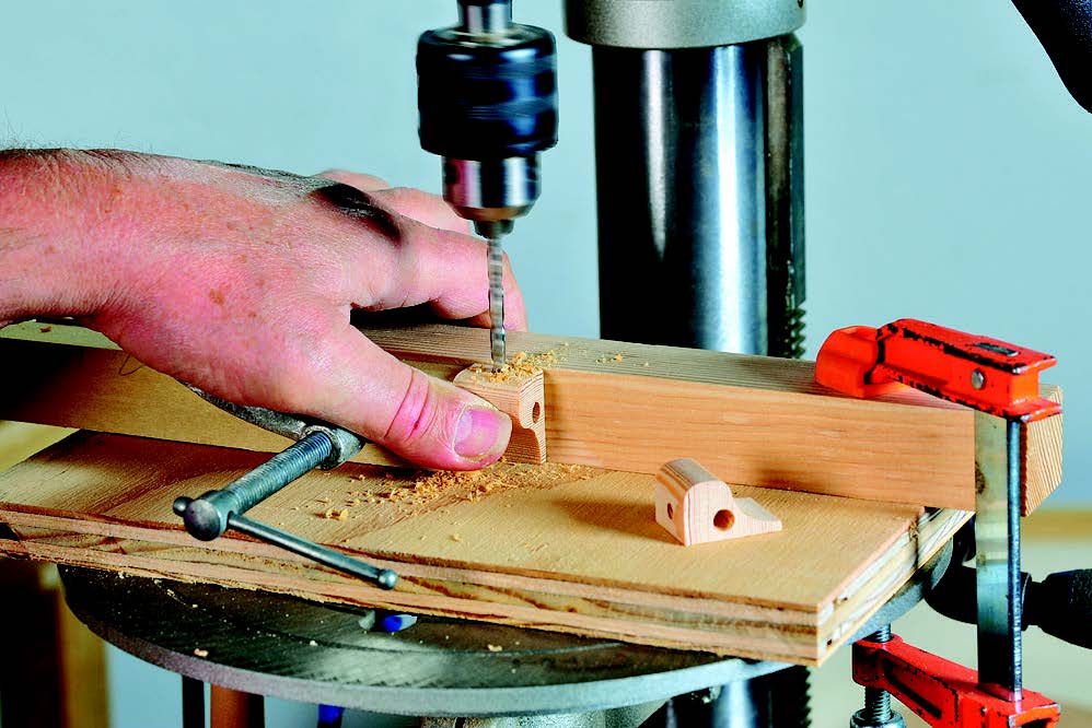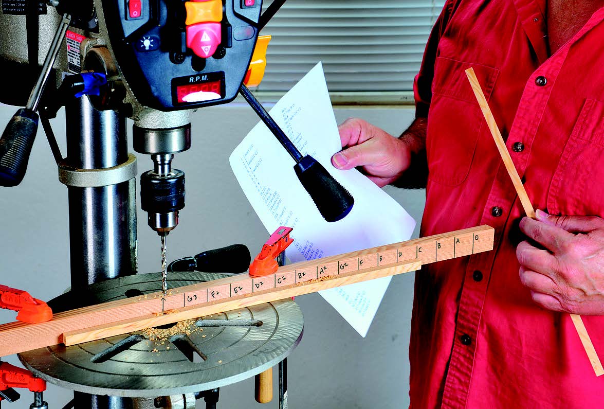 The next step is to drill holes in the slats for the loom pins (available from craftparts.com, item TP1030) that will trip the pivots when the drum turns. After creating a song layout sheet (see online instructions), remove only the slats that will receive pins, leaving the slats that don’t need drilling on the alignment board. To make drilling quick and accurate, create a 3/4″ x 1″ x 30″ positioning fence for the drill press, marked with a series of perpendicular lines: The first line at the center of the fence marks the centerline of the 3/16″-diameter drill bit. Draw the next line 3/4″ to the right of the first line and label it “G3,” for the highest note on the xylophone. Space each subsequent line 1 inch to the right of the previous line, and label it with the next lowest note: F2, E2, D2, etc., all the way down to G1, the lowest note. After aligning the fence center mark to the bit and setting the fence so that slats will be drilled on center (widthwise), clamp it to the drill press table. Now, with a slat face-up and its numbered end on the left, line up the slat’s right end with the desired note you wish to drill a hole for and bore the hole 5/16″ deep. Align the slat to other note marks, as indicated by your song layout sheet, to drill subsequent holes. Do this with the remaining slats until all the holes are drilled.