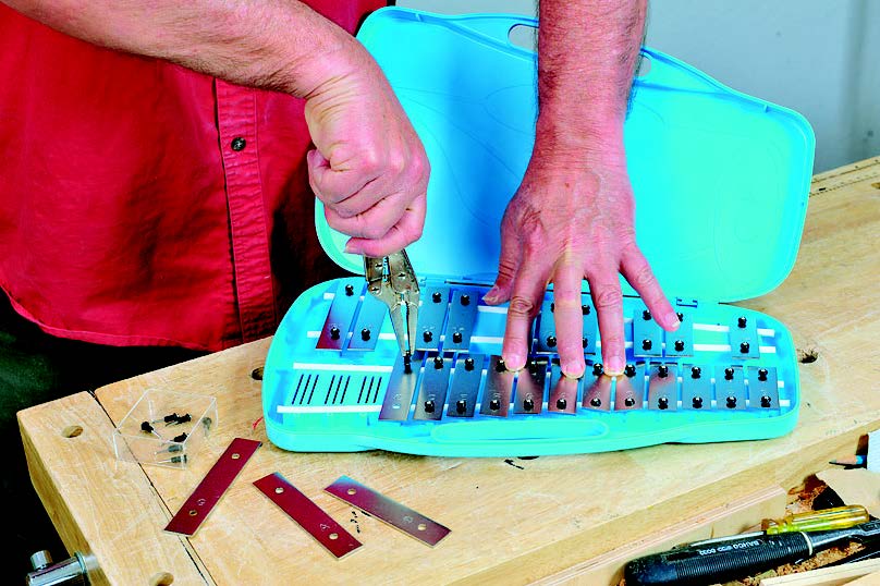 The music box uses metal tone bars taken from an inexpensive xylophone (the Lyons 25-note xylophone, available from Amazon.com). First, use a pair of needlenose pliers to remove the pins and grommets that secure the 15 chromatic tone bars (not the sharps and flats) to the plastic case. Carefully peel up the two foam strips that the bars rested on and set them aside where their adhesive strips won’t get fouled with sawdust.