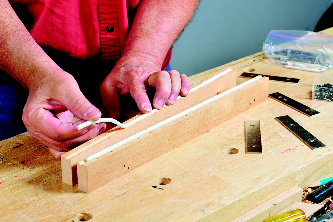 To make the new rack to support the tone bars, cut the two rails and two crossmembers, sized as per the Material List. Chuck a V-groove bit in the router table and plow a 3/16″-wide groove, spaced 3/16″ from the rail’s inside edge, along the length of each rail. Next, drill 15 holes 1/16″ in diameter for the tone bar pins in each rail, spaced one inch apart relative to the centerline of the rack. Glue the crossmembers between the rails, making sure the spacing between the holes for the widest tone bar is 2-3/4″, and 1-7/16″ for the narrowest. Stick the foam strips you removed earlier into the rail grooves, then mount the tone bars by gently tapping the pins/grommets into their holes.