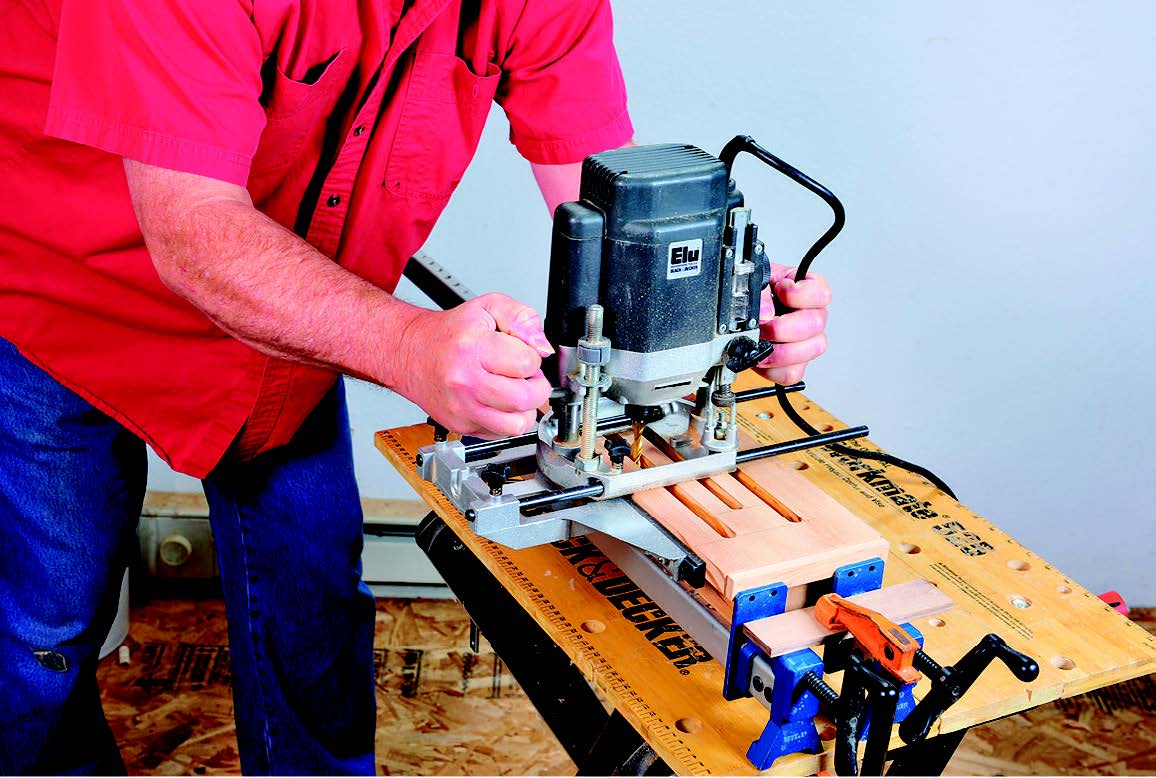 Next, rout three slots on the front of the case to allow the sound of the music box to be heard without lifting the top. Make these slots with a 1/2″-diameter spiral fluted bit in a plunge router fitted with an edge guide. Clamp the ends of the case front with a pair of bar clamps, placing a scrap piece between the piece and the clamps, then secure the bar clamps to the work table. Mark out the slots (see the Drawing) on the front, then set the router’s fence, start the router, and plunge the bit to cut each slot all the way through the workpiece.