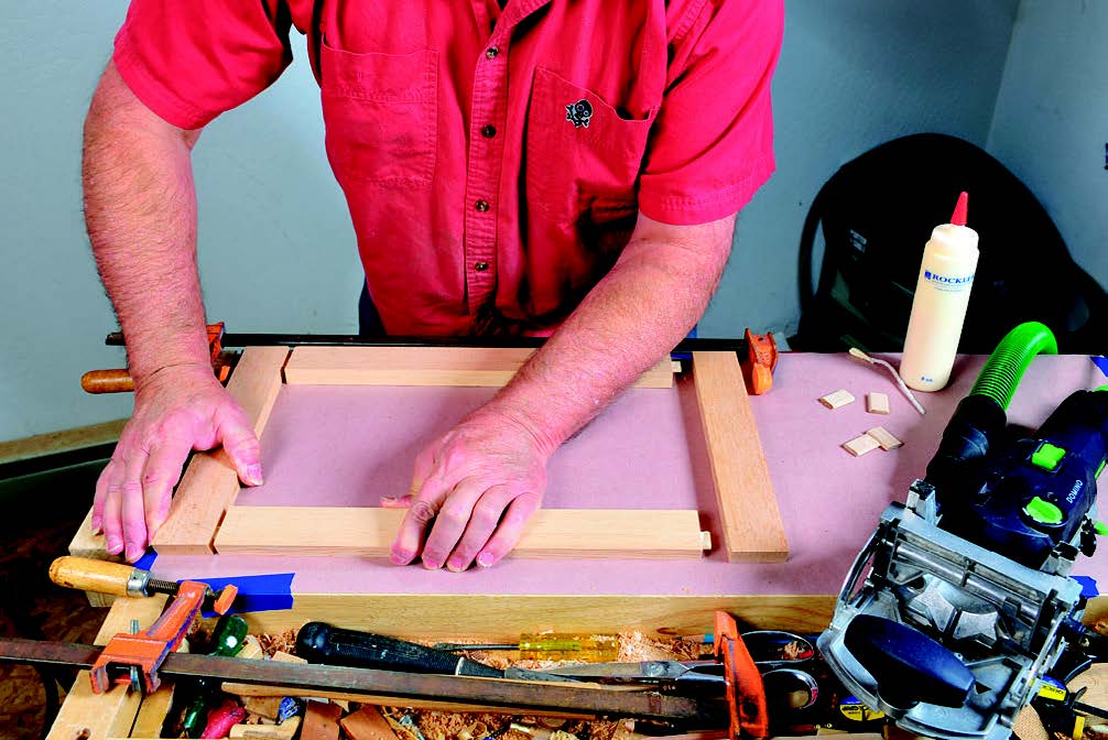 To make the frame for the angled glass door at the front of the case, cut the stiles and rails to length, noting that the extra length of the stiles and width of the rails allows for beveling of the frame’s edges later (see the Drawing). You can join the frame members with dowels or with loose tenons, such as those cut by Festool’s Domino tool. Once the frame is glued up, rout a 7/16″-deep, 3/8″-wide rabbet (for the window glass) around the inside of the back side of the frame, using a piloted rabbeting bit. Square up the corners with a chisel. Next, on the table saw, cut a 17.5˚ bevel on the back edge of the frame, as well as on the front edge of the case top. Mortise the back edge of the frame, as well as the forward edge of the case top, to hold a pair of 2″ x 1″ hinges, each spaced 2-3/8″ in from the frame edges. Chop out both 1/16″-deep mortises by hand with a chisel, then drill pilot holes for the hinge screws.
