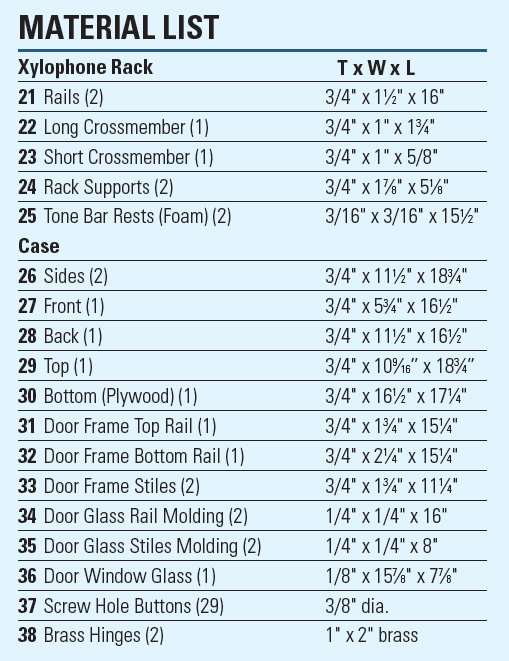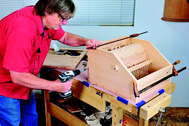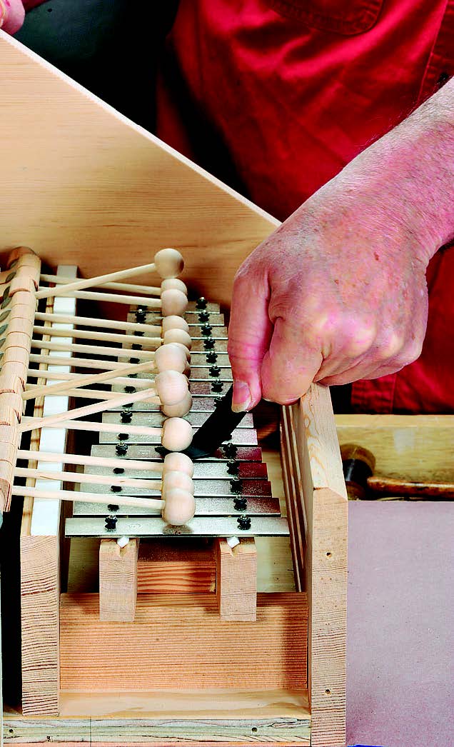 Before final glue-up, preassemble the case, setting the drum and mallet pivot block assemblies into place and temporarily clamping all the case parts together. Use a 3/32″ bit to bore pilot holes through each case side, then screw the parts together. To make sure that the music box will play correctly, set the mallet support (with the foam mallet rest strip, piece 20, you’ve made from weatherstripping adhered to its top edge) and xylophone rack and supports into place and check the fit and alignment. The mallet heads should be centered on the tone bars and come to rest about 1/16″-3/32″ above them. You can adjust this by trimming (or shimming) the mallet support and/or the xylophone rack supports. Once the notes sound crisp, screw the rack to the supports, and the supports to the mallet rest.