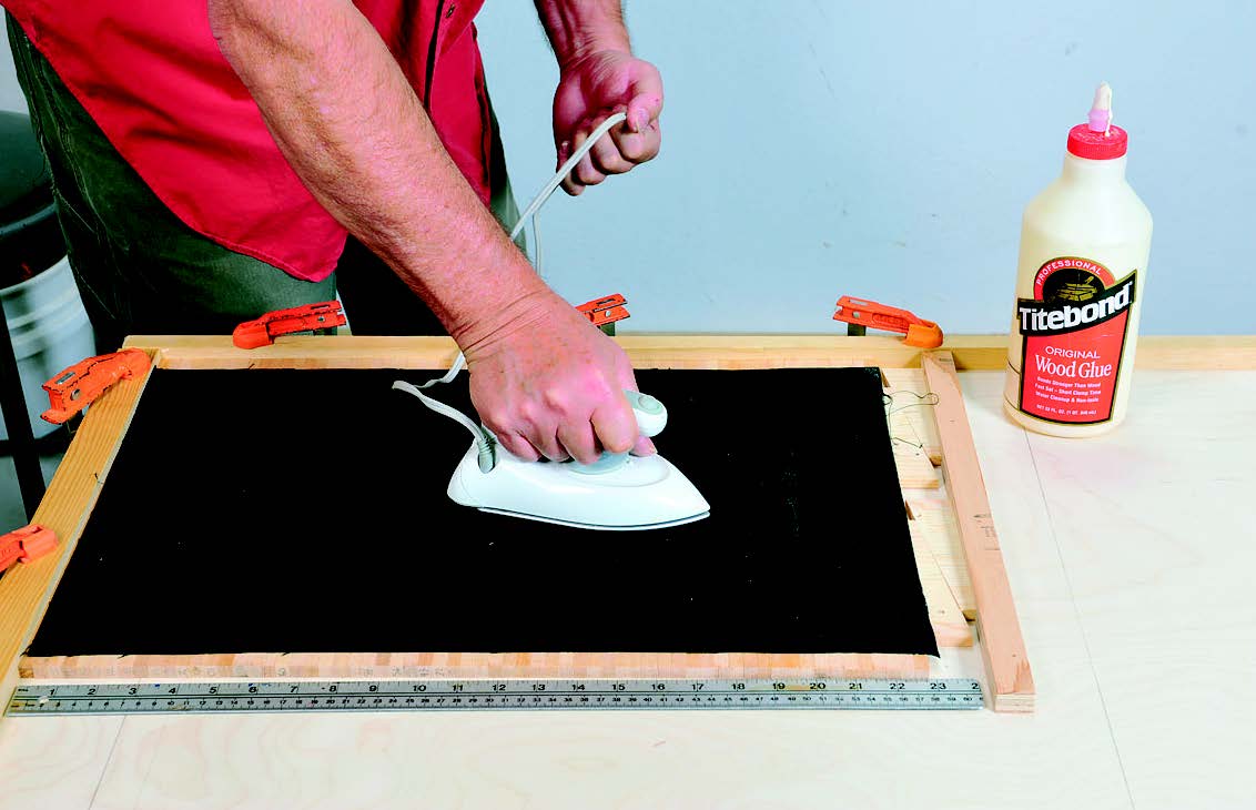 Cut a piece of 12-ounce duck canvas that’s 14-1/2″ wide and a little longer than the slat assembly. Apply yellow glue liberally to the surface of the canvas, spreading it evenly with a squeegee. Turn the canvas over, center it on the slats and press it down, working from the center to the edges to remove wrinkles and air bubbles. Next, use an old household iron set to the “wool” setting to quick cure the glue. After waiting about 10 to 15 minutes for the canvas to cool, remove the assembly and flex each joint between adjacent slats. Sand the slat faces to final smoothness.