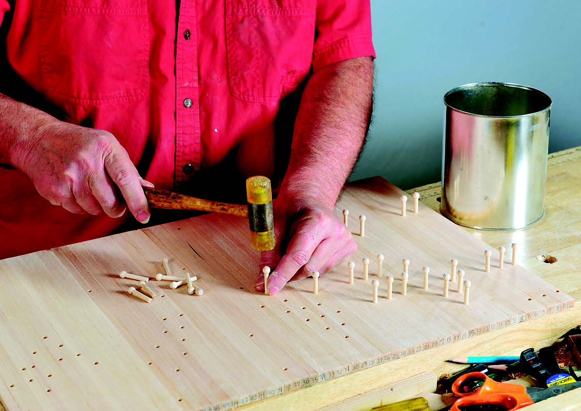 The pin to be trimmed is inserted up to its head in the hole, then cut with the saw (the next pin pushes the waste piece out through the hole on the other side of the block). Now, with the slat assembly on the workbench, gently tap the loom pins into their holes.