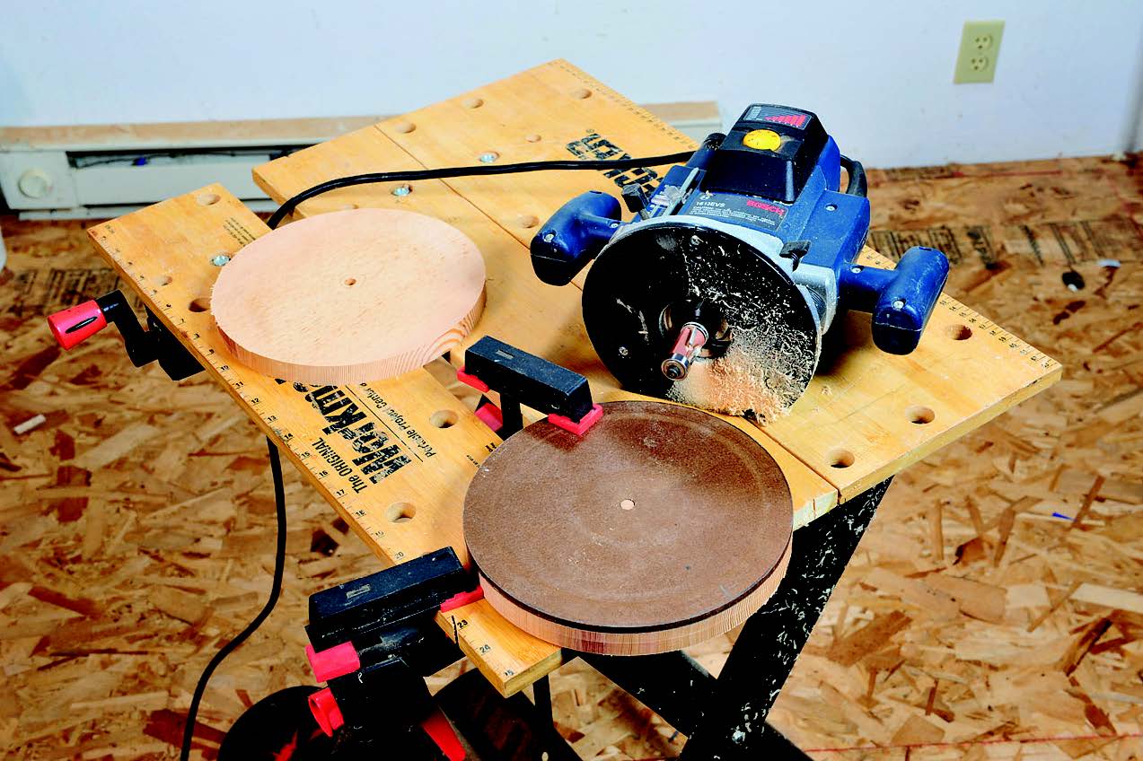 A pair of 3/4″ wood discs make up the ends of the drum. To assure that both discs are perfectly round and exactly the same size, turn a template on the wood lathe: First, drill a 3/8″-diameter hole in the center of a blank cut from 1/4″ hardboard. Mount this on the lathe and turn it to exactly 8-3/8″ in diameter. Cut two disc blanks and drill a 3/8″ hole in the center of each. Rough-cut these round, making each just slightly larger than the final diameter will be. Use a piece of 3/8″-diameter dowel to align the template to the blank, then use double-stick tape to temporarily fix the template atop the blank.