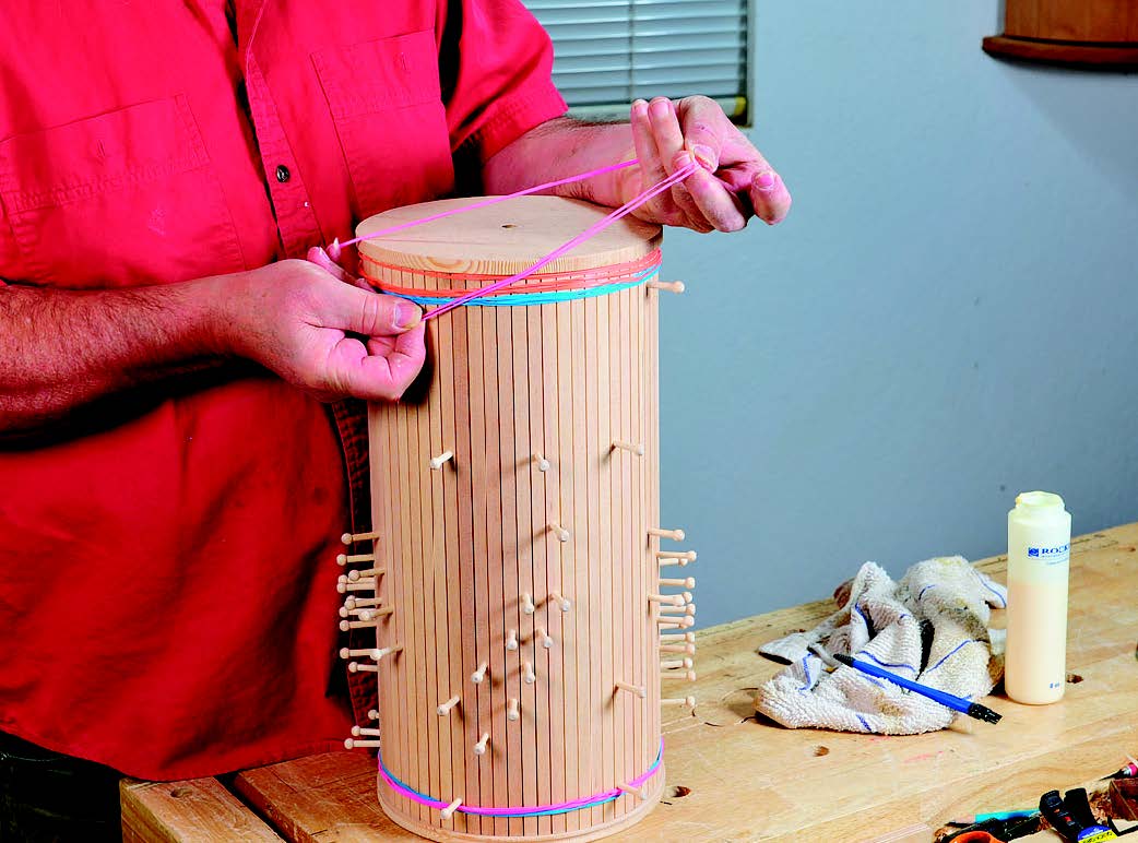 To join the drum parts together, set the pulley-groove disc rabbet side up on the bench and insert the 3/8″ steel rod axle into its center hole. Now wrap the slat assembly around the disc, with the numbered ends pointing down. Set the slats into the rabbet, then put a couple of large rubber bands around the bottom of the slats, to hold them in place. At the top of the assembly, apply glue to the ends and inside edges of the slats as well as the rabbet in the other drum disc. Fit the disc onto the slats, making sure their ends are flush with the disc shoulder, then pull on enough large rubber bands to clamp the slats tightly against the disc. Once the glue is dry, flip the drum over and repeat the gluing process with the pulley disc. To fill the small gap between the first and last slats, cut one of the extra slats to the necessary width, then glue it in place.