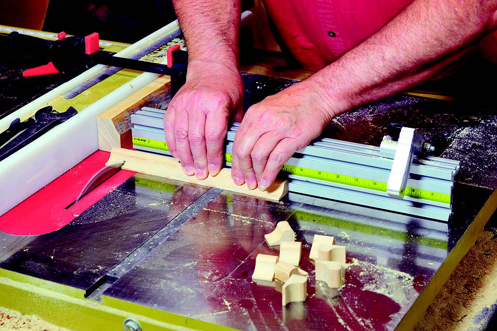 The music box’s notes are played by 15 ball-headed mallets, one for each tone bar. Each mallet attaches to a pivot block, shaped as shown in the Drawing. The easiest way to make the pivot blocks is to create a “loaf” (a long strip that’s been shaped to the profile of the blocks), then cut the individual blocks off one at a time. Start by ripping a piece of stock to 3/4″ x 1-3/16″ x 20″. Take a 1/2″-radius cove router bit, remove its pilot bearing, and mount the bit in the router table. Set its height and the position of the table fence to cut a cove shaped as shown in the Drawing, above. It’s best to rout the cove in two passes: The first pass removes most of the waste; the second trims the cut to its final size. Use a 1/4″-radius piloted roundover bit to shape the profile on both top edges of the loaf strip, then sand the strip smooth. On the table saw, use a miter gauge to cut the 15 individual 15/16″-long pivot blocks from the loaf.