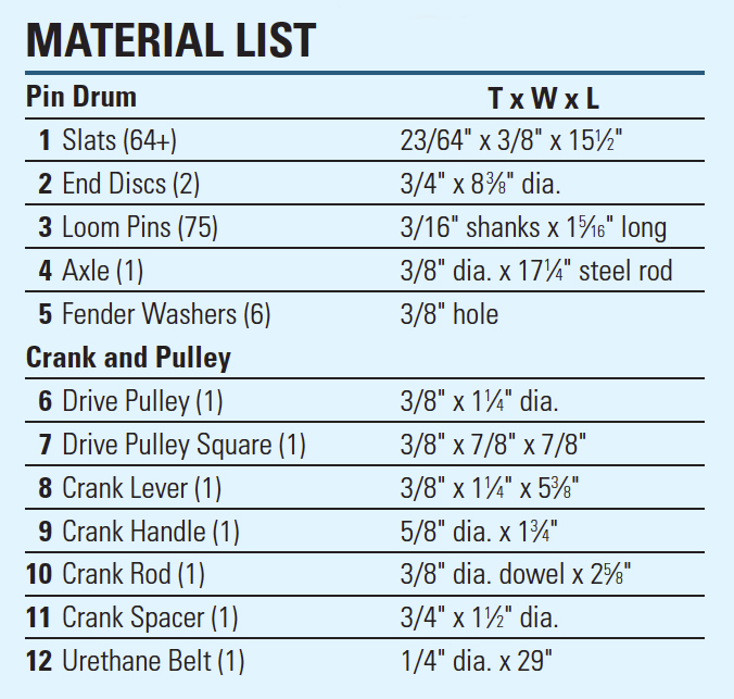 I thought it would be an interesting challenge to create my own version of a music box, built from mostly wooden parts. The one I came up with is based on an antique hand-cranked barrel organ. Here’s how it works: A drum, made of narrow slats attached to a pair of end discs, rotates as it’s driven by a hand-cranked pulley. As the drum rotates, small pins that pivoting blocks, each of which is fitted with a small round mallet at the end of a rod. As the pin rotates past, it releases the pivot block and the mallet falls and strikes a metal xylophone tone bar, thus producing a musical note. There are a total of 15 mallets and tone bars, and the pattern of pins on the drum determines which notes are struck — and, hence, the tune the music box plays. I arranged the pins of my music box to play “Heart and Soul,” but it could be set up to play just about any short song. The entire mechanism fits into a case with an angled front covered by a glass-paneled door, so you can see the mechanism operate as the song plays.