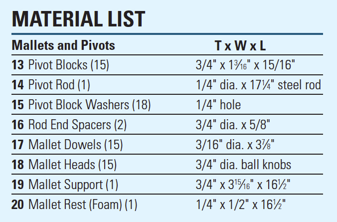 Each individual block now receives two holes: a pivot hole for the 1/4″-diameter steel rod that supports all the blocks; the other for the 3/16″ mallet dowel. To drill the pivot hole (positioned as shown in the Drawing above), chuck a 17/64″-diameter bit and drill lengthwise through each block. Next, chuck a 3/16″-diameter bit and bore the holes for the mallet dowels. After gluing the ball knobs (craftparts.com, item KBB075) onto the ends of the mallet dowels, press them into the pivot blocks (don’t glue them yet). Slip the blocks onto the 1/4″ steel pivot rod, fitting a single 1/16″-thick washer between each one. Make the two end spacers by center drilling a pair of 5/8″-long, 3/4″-diameter dowels, then slip them onto the ends of the rod, adding washers at the outside ends.