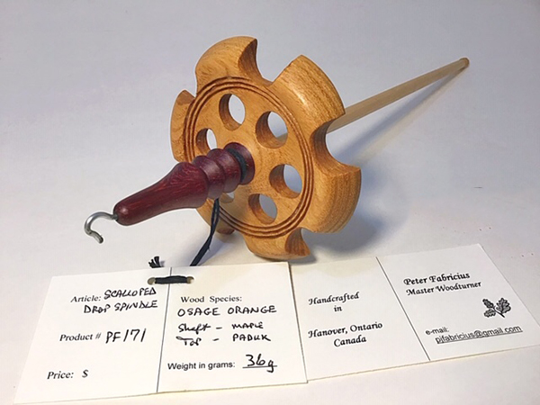 “Here is a project I completed in 2021. It is a drop spindle that is used to spin wool into yarn so you can knit a sweater, socks or a warm winter hat. I must admit that I cannot use this tool, but I sure can make a variety of models for the spinners and weavers that buy them. My latest spindle is #PF247, so I guess I have made a few! I have used many different woods and drop spindle models. Good luck with your project! I have no issues with Osage orange; it handles very nice, like maple.” – Peter Fabricius