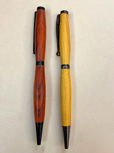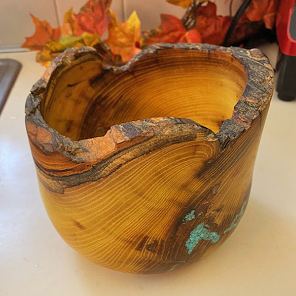 “I recently moved to Kansas City. My real estate agent showed me her wood pile for her fireplace and there were some Osage orange (also called hedge apple) logs in it. She let me have a couple! So far, I have one bowl (turquoise/CA glue inlay in the bug holes), several pens (it’s the right one in the photo of two pens), two more bowl blanks that are waiting for the right time to meet my lathe and a whole bunch of pen blanks that are ready to be turned. Osage is hard, and it is tough on my turning tools. I hit the CBN wheel often. But when it is finished, the surface can be glass smooth. If you want to retain the yellow color, keep it out of sunlight. UV light will turn it more orange/brown.” – Dennis Sosnovske