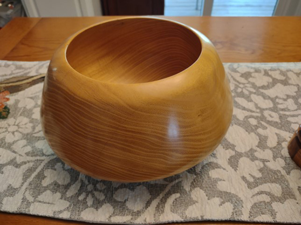“I got a free log of Osage orange from the Ohio Valley Woodturners Guild. This is a bowl I turned from it. Kind of heavy wood but easy to turn. Beautiful grain and color.” – Paul Trenn