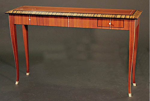 He has also made an Art Deco style console table which also features an inlay but, “rather than your typical stringing that goes around the outside of a veneered field, it goes off into a curve and terminates in this little flower inlay motif. I think that’s a good example of taking the idea of what a typical string inlay on a veneered tabletop would look like and then playing with that and subverting it a little bit.”