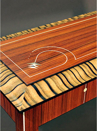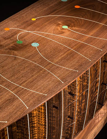 For example, his recent “Escape Velocity” sideboard is styled in the Art Deco manner, with stringing that goes up through the doors, but as the inlay continues on to the top of the piece, “The stringing goes off in all kind of crazy directions, and it terminates in an inlaid circle of dyed veneers. It’s intended to kind of look like fireworks, or a stylized sort of fireworks.”