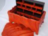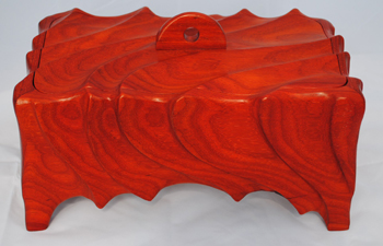 I have been building sculpted boxes and recently built this one that almost seems to glow in the dark. The bright orange color is Padauk and the trays are built with Padauk inserts and Wenge. I made the inserts with mini dovetails for strength. The two trays and the box bottom are lined with black velvet.