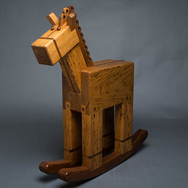 The racing animals, Pamela said, are where she started developing her doweling system. “I thought, ‘These ears cannot come off, ever. So I had to make things that could be in a public place with children climbing on them for years that would hold up.” She explained, “I love to slice a dowel horizontally, I mean along the length, so that they give a little so that things fit. The technique I’ve developed myself over the years is, if I’m putting two boxes together to make a body, the doweling and the holes for the doweling will look like a Chinese checkerboard, lots of holes and lots of dowels. And my things can really go together.”
