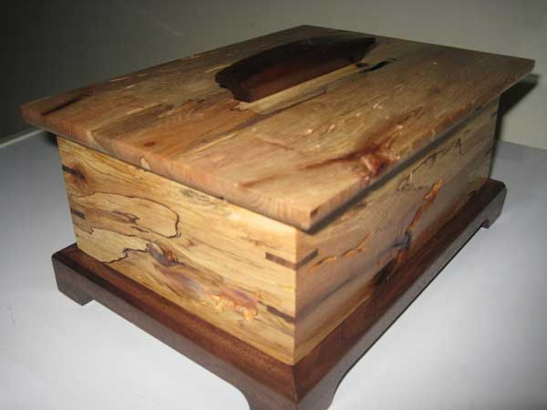 A limb from my beautiful pecan tree broke off during a storm. It fell, piercing my neighbor’s carport roof and damaging the grill of her car. I salvaged the limb to make lumber which turned out to be spalted. Using a pattern and adding a bit of walnut, I made a box to present to her with apologies for the inconvenience and damage. She was thrilled.