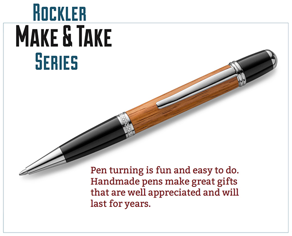 All 37 Rockler stores across the country will offer the pen turning classes. Class size will be limited to six participants per session, so lots of one-on-one help will be available. Attendees under the age of 18 will need to be accompanied by an adult. The class will last approximately 45 to 60 minutes.