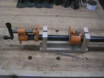 Use your bench vise and a pipe clamp to hold narrow or wide boards on the bench top for planning or other work. No bench dogs or dog holes required. With this simple fixture a pipe clamp is held securely in the vise while still allowing for adjustment of the pipe clamp. It will hold boards from 13/16″ wide to the length of your pipe. Can be made from a single 3/4″ x 2-1/2″ x 16-1/4″ board.