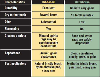 The primary differences between oil-based and water-based polyurethanes relate to how they are made. Oil-based, whose proper name is “oil-modified urethane,” is produced by reacting common finishing oils, like linseed oil, with a chemical that causes the oil to form larger molecules. A good rule of thumb is that larger molecules mean more durable finishes.