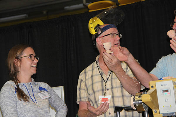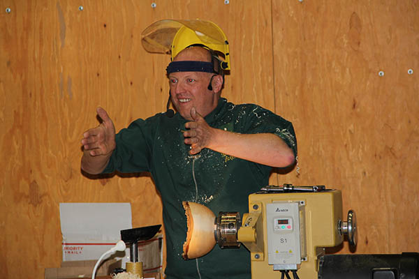 The symposium also incorporates special events, with one highlight being the Great Egg Cup Race, in which each contestant is given a 2.25-in. x 2.25-in. x 4-in. piece of hardwood prepared for mounting in a scroll chuck. Two lathes are set up, each with a tool-rest along the length of the wood and across the end. Contestants compete individually or in teams of two for fastest times and best accuracy based on a drawing – with most opting to go for the speed. According to a former Symposium participant, the late Bill Jones, “You can watch heaps of really good wood being totally ruined by the world’s finest turners.”