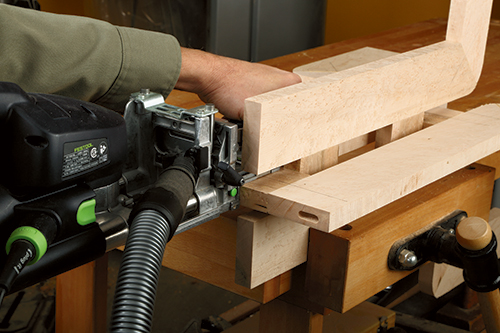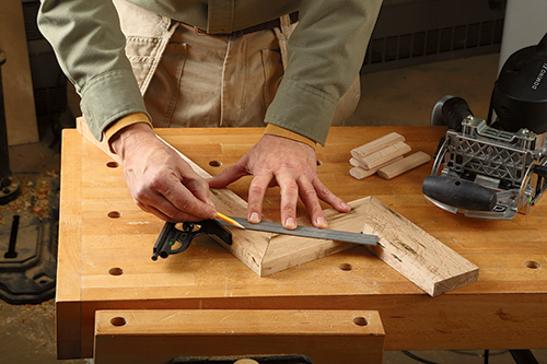 to length. Because I had taken the time to make a full-size mock-up, I was able to set up the saw from those measurements — you can look to the Material List for those details. Cut and miter pieces 1 through 3 to length. Next, mark the locations of the loose tenons at the mitered joints between the lower and center leg components. Form the mortises and test the fit. (If you are making your own loose tenons, there are a couple of extra steps to take here.) If the joints fit properly, glue and clamp them together. Wet both surfaces of the miter joint with a thin coat of glue, and be sure to get glue in the mortises. I found I only needed one clamp to close the joint securely. Allow the glue to cure.