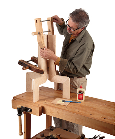 You can now go back and take the lower leg subassemblies out of their clamps and mark and cut the joints that will allow you to glue the upper leg pieces to the glue-ups. When that is done, glue the upper leg sections in place and set them aside until the glue is dry.