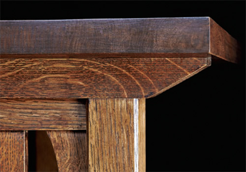 The through mortises on the legs (and the stretchers, not shown here) were chopped out using a mortising machine. Through tenons are not only a sound structural bit of joinery, but they also are a significant part of the Arts & Crafts vocabulary of style.