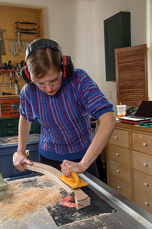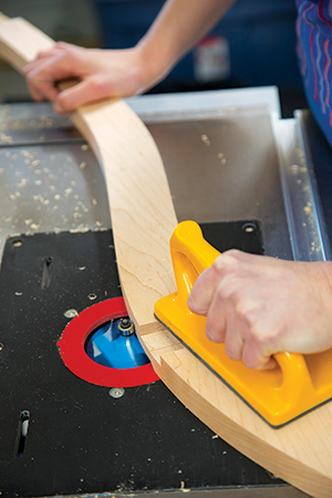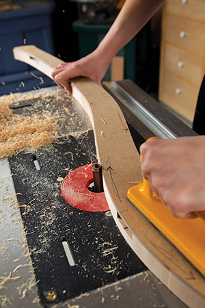 These curvy legs require that you know how to rout off the remaining waste with respect to the grain. When you are flush-trimming, you will need to study the grain on the legs and rout so that the cutter is combing down the fibers, not ripping them up.