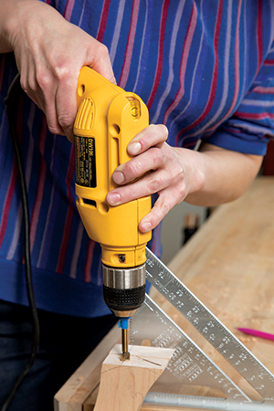 My casters required 3/8″-diameter, 1-1/4″-deep holes for their posts, which I drilled with a Forstner bit. With that done, you can finally doublestick-tape the legs together and cut and sand their top ends round so they match.