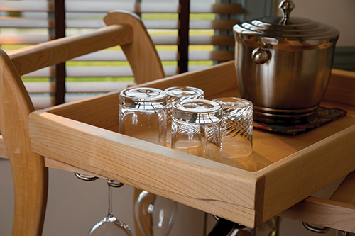 I built this version from maple. The metal holders for the stemware and wine bottles are attached to the supports beneath the removable top tray, and they have a brushed nickel finish; I think it goes well with the light-colored maple. The caster wheels are actually made of walnut. Their metal housings were originally zinc-coated, but I used 400-grit sandpaper to lightly sand the metal down to a silver finish. My cart will live primarily indoors, but if you want to keep yours outside, be sure to use an insect- and rot-resistant wood so it will weather many outdoor seasons to come.