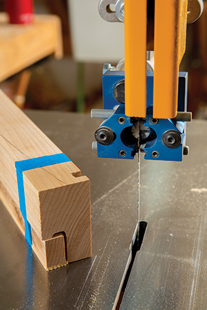 Raise the bit so it cuts slightly higher than the rabbet is tall to form a finger recess at the top. When this milling is finished, you can cut the broad arches into the four tray faces, and here’s a safety tip: tape the square offcuts from the rabbeted areas back into place to support the top tray ends so they won’t wobble or tip when you band-saw the curves. For this operation, a 1/8″ piece of scrap wood replaces the material removed by the saw blade. Cut the arches, and sand the surfaces smooth. I did this work on a benchtop belt sander.