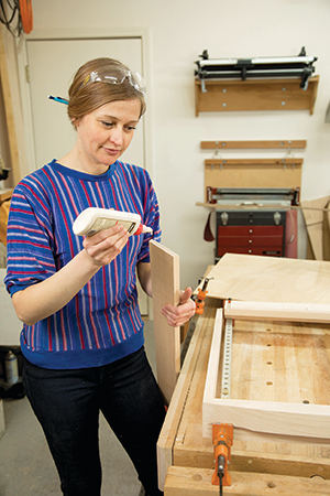 I switched to a 1/8″ roundover bit to ease the other sharp edges on the cart, but don’t rout the outside edges of the bottom tray or the top tray supports where they will fit into the leg dadoes, or there will be noticeable gaps where the parts come together after assembly. Then go ahead and thoroughly sand the surfaces of the legs, tray components and tray support pieces. I worked through the grits up to 220, using a 1/4-sheet sander and then a round of hand sanding with the grain. Dry-fit the top and bottom trays together, and take inside measurements across the bottom grooves so you can cut plywood panels for the tray bottoms. Sand those smooth as well.