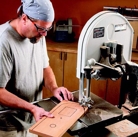Grab the base blank that you made earlier. Use the core (or, if you wish, the core template) to trace its shape onto the base blank. Use the band saw to cut the base to shape, but stay outside of the lines by a strong 1/16″ and set it aside with the core.