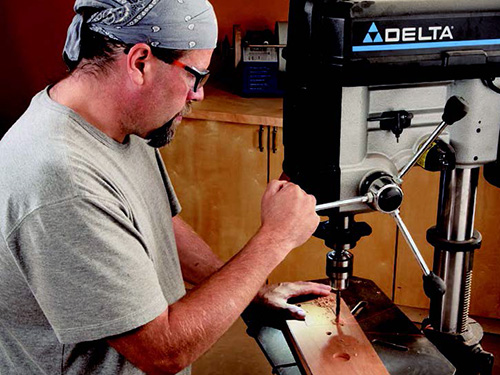 Again, reach for the double-sided tape and secure the drilling jig to the playing surface. Chuck the bit in the drill press and start drilling. But go slow! Even with the jig as a guide, I found that I had to take my time and be very deliberate about this process. It was also useful to free any tiny wood chips that clog the centering sleeve on the drill bit.