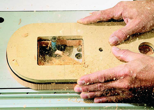 Next, drill out the four corners of the card recess as shown in the photo. I used a handheld jigsaw to remove most of the waste from the card recess. When that is done, use a couple of pieces of two-sided carpet tape (not too much!) to secure the core template onto the core. Then chuck a 1/2″ bearing-guided pattern routing bit into your router table.