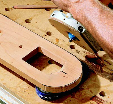 Trim the card recess opening as shown. Then you can shape the outside of the core in the same manner. Cutting the curved shape at the end of the board with a router bit can be a bit tricky. You may be better off just sanding it smooth to your marked line, although I did OK by climb-cutting around the radius. Pop the template off of the core and set it aside for now.