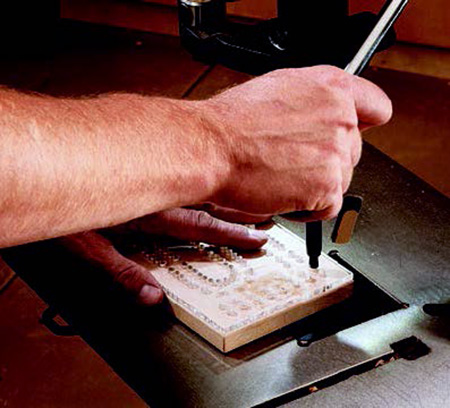 It’s now time to move on to the playing surface. If you made a template for this piece, grab it and the blank you cut earlier and go through the same shaping process you did with the core. (But don’t drill the peg holes yet; just make the outside shape.) If you did not make a template, you have a bit more layout to do, but it shouldn’t take long. Once the piece is shaped, grab the drilling jig you ordered and the self-centering drill bit and head over to the drill press. (What’s that? You didn’t order the drilling jig and bit? What are you, crazy? Let me strongly affirm, here and now, that you should not try to make this project without the jig…sorry. It is simply too hard to get all those holes placed properly without it. There are 260 or so holes to drill — that’s a lot of alignment!)