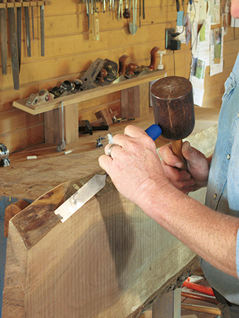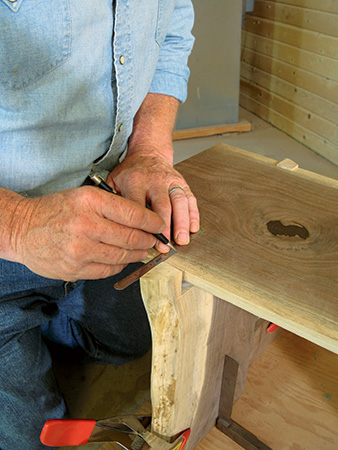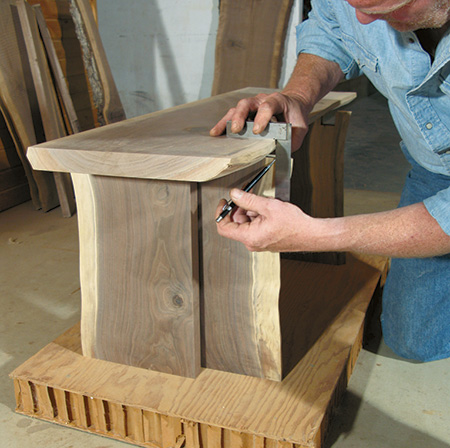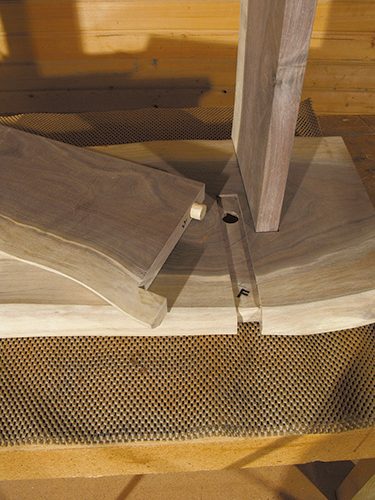 My solution for putting nature’s artistry to best effect is the little foyer bench you see here. It’s actually the fifth adaptation of a bench I’ve made before, and I think it accomplishes my goals quite well. For one, you aren’t bombarded with a lot of straight edges on this piece. The back edge of the top is, for the most part, flat, so the bench can be pushed up against a wall. And, while the inner edges of the leg pairs that support the top are flat, the shadow line they form is what really catches the eye. Their outer natural edges and creamy-colored sapwood flow nicely into the sapwood on top to continue those wonderful meandering lines all around the front. I like the fact that the leg pairs, when viewed as a whole, still look like the much wider, waney-edged boards from which they came with sapwood on both edges. I also tried to harmonize the intersection of the legs and top by incorporating some open-ended through tenons into the piece; they rest against square notches in the seat board, but their outer edges retain that natural shape — almost like stubs of branches coming up through. As you can see, these tenons stand proud of the seat — 5/16″ to be exact — to really bring home a sense of visual strength and substance.
