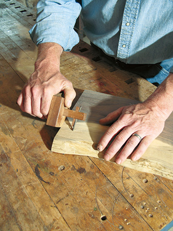 Hey, you might be wondering … where did he get 7/8″-diameter dowels? Well, good question, and here’s the answer: I took a 1″ oak dowel rod and shaved it down at my table saw by spinning it slowly against the miter gauge. It’s not difficult and, working carefully, I reached a snug fit for those loose-tenon joints. Once I cut four dowels to length, I gave the seat board and legs a final scraping and sanding while the surfaces were still easy to reach. I could see the homestretch of this project coming into view!