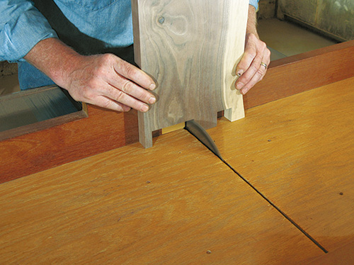 After creating these reference edges, I could head to the table saw to crosscut the parts to length. Those were square cuts for the four legs, but I treated the ends of the top a little differently. Here, I tilted my saw blade to about 30° and positioned the top facedown on the saw table before making the cuts. This was my reasoning: I wanted these end bevels to mimic the natural line where the sapwood was wrapping around the heartwood. Call me a sucker for nuance and aesthetics, I guess. The bevels would face up toward the seating surface and not hide underneath it, to keep that hefty appearance of the seat board’s thickness.