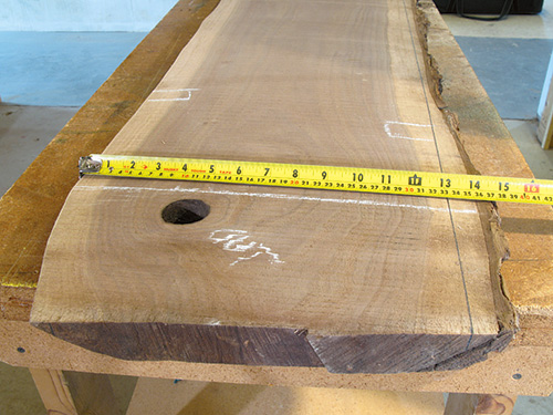 Despite my goal of making this little bench as “green” as possible and capitalizing on its natural beauty, form still has to follow function for me. A bench doesn’t have much purpose if you can’t sit on it. So, I had to keep ergonomics in mind as well as aesthetics when laying out the parts. The top is 42″ long to fit one person well, and the four leg components are 16″ tall to raise that top to a comfortable seating height. I decided I would set the final position of the legs and the overhang of the top later, but I did chalk their positions out preliminarily before commencing with building to make sure the top would be long enough to suit its purpose — as well as to avoid defects like open knotholes.