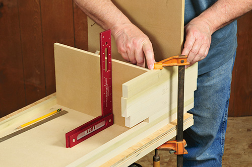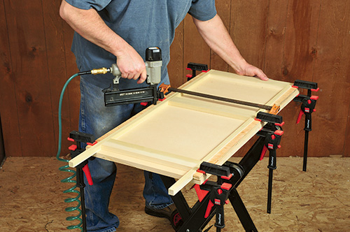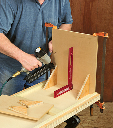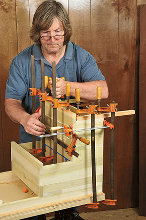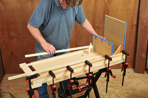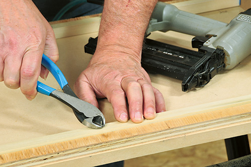 Because the kitchen stool has a lot of parts, it’s important to make careful preparations before you begin the glue-up. In addition to having all the clamps you’ll need on hand, cut some wooden strips to serve as clamping blocks that distribute clamping pressure and prevent dents to stool parts. To prevent glued parts from sliding out of position when clamping pressure is applied, I recommend partially driving a small brad into one half of each mating surface, then snipping it off so only a small nub protrudes. To speed up this process, you can drive short pins or small nails with a pneumatic nail gun set to run on low air pressure, so it doesn’t drive the pin all the way in.