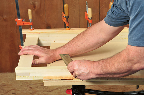 After taking a test cut or two on the cutoff saw, trim one end of each length of stock, marking it with a pencil slash. Now clamp a fence stop at 16 inches, and cut all the parts of that length.