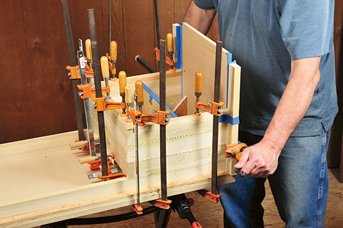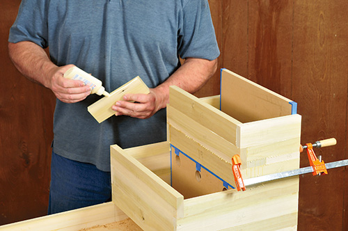 The third stage of assembling the bottom step requires gluing the most pieces at once, so be prepared to hustle a bit. It’s best to tackle this stage on a cool day, to give the glue the longest open time before clamps must be tight (alternatively, you could break this stage into two sub-stages). Work as before, applying glue and stacking the parts in order, taking care to keep their edges flush and aligned.