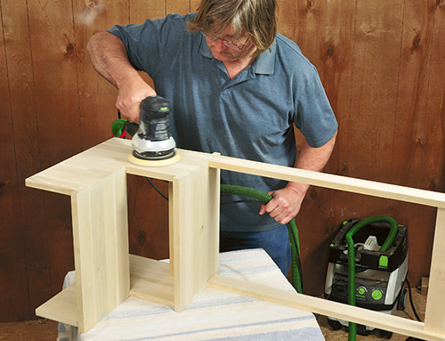 If all the assembly stages have gone well and the parts were carefully aligned, there’s very little sanding or scraping necessary to smooth the stool’s surfaces. On areas where parts have slipped a bit, a portable belt or random-orbit sander fitted with an 80- or 100-grit belt or disc will level surfaces in short order. Once all surfaces are flat and smooth, what happens next depends on your taste: If you like the austere, angular look of the stool as it sits, simply ease all sharp edges with a little hand sanding. If you’d prefer a more finished looking piece, you may use a router fitted with either a roundover or chamfer bit to profile the edges of the treads, and maybe the sides, back uprights and top rail as well.