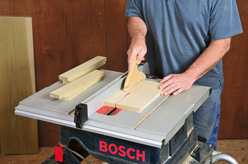 Once the setting is confirmed, rip enough stock for all the 2-1/4″-wide parts on the cut list at one time, without resetting the fence. If you’re cutting more than one part from a particular board, joint its edge after each rip cut, to ensure that it’s straight and square. Once all the 2-1/4″ stock is ripped, reset the fence to 1-1/2″ and rip all those parts and then move on to the other required widths.