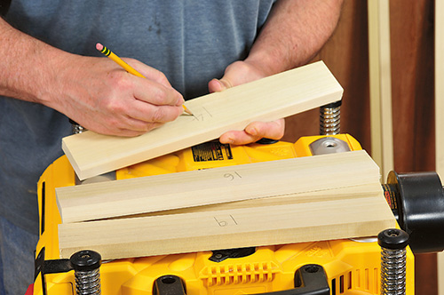 Next, take all the parts to your thickness planer and run each one through twice, planing a scosh off both sides until all parts are exactly 3/4″ thick. Finally, mark each part with its cut list number.